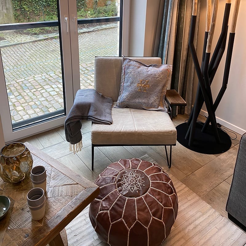 Læderpufs er lavet i gedeskin og vil med tiden få en smuk patina. Ønsker du din puf mere mørk og blank, så kan du give den lidt læderolie. Lige i starten når du tager den i brug kan den lugte lidt af læder. Dette går hurtigt væk igen. Vil du fremskynde den proces, så sæt den ud i solen lidt, så går det væk.[/vc_column_text][/vc_column][vc_column column_padding=”no-extra-padding” column_padding_position=”all” background_color_opacity=”1″ background_hover_color_opacity=”1″ column_link_target=”_self” column_shadow=”none” column_border_radius=”none” width=”1/3″ tablet_width_inherit=”default” tablet_text_alignment=”default” phone_text_alignment=”default” overlay_strength=”0.3″ column_border_width=”none” column_border_style=”solid” bg_image_animation=”none”][vc_custom_heading text=”Historien bag” font_container=”tag:h3|text_align:left”][vc_column_text]Små pufs er lette at tilsætte din indretning og hurtig få et eksotisk udtryk og et mere personlig touch. Min leverandør af skindpufs har mange års erfaring med at lave gode og meget holdbare pufs og han eksporterer til flere steder rundt i verden. Alle mine pufs er i gedelæder, da det er det der giver den blødeste og mest fleksible puf.[/vc_column_text][/vc_column][/vc_row]