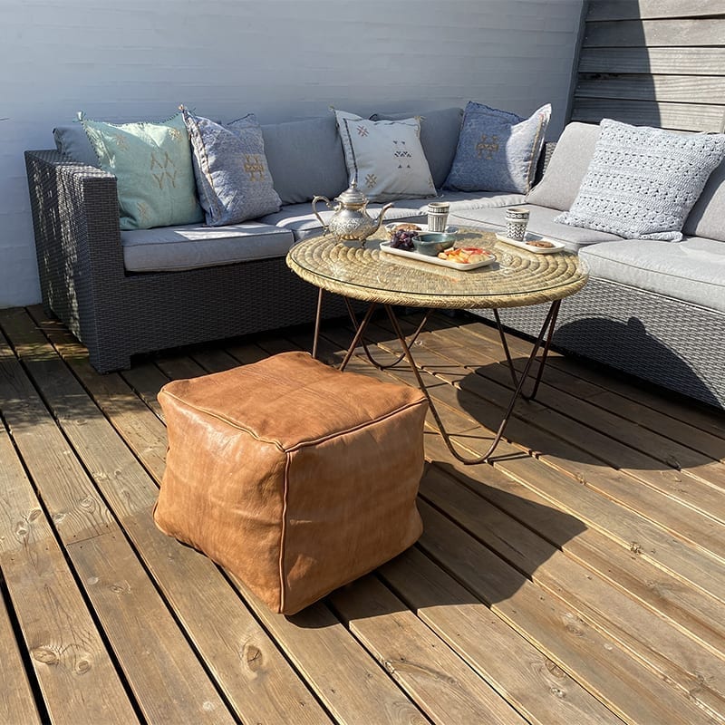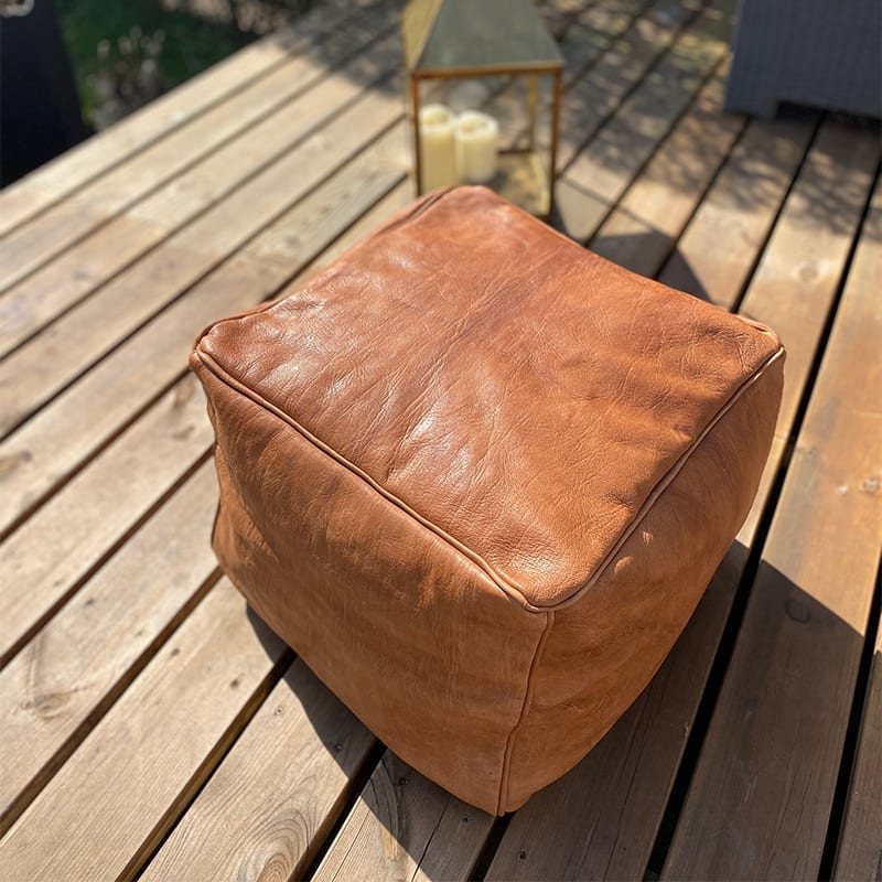 Læderpufs er lavet i gedeskin og vil med tiden få en smuk patina. Ønsker du din puf mere mørk og blank, så kan du give den lidt læderolie. Lige i starten når du tager den i brug kan den lugte lidt af læder. Dette går hurtigt væk igen. Vil du fremskynde den proces, så sæt den ud i solen lidt, så går det væk.[/vc_column_text][/vc_column][vc_column column_padding=”no-extra-padding” column_padding_position=”all” background_color_opacity=”1″ background_hover_color_opacity=”1″ column_link_target=”_self” column_shadow=”none” column_border_radius=”none” width=”1/3″ tablet_width_inherit=”default” tablet_text_alignment=”default” phone_text_alignment=”default” overlay_strength=”0.3″ column_border_width=”none” column_border_style=”solid” bg_image_animation=”none”][vc_custom_heading text=”Historien bag” font_container=”tag:h3|text_align:left”][vc_column_text]Små pufs er lette at tilsætte din indretning og hurtig få et eksotisk udtryk og et mere personligt touch. Min leverandør af skindpufs har mange års erfaring med at lave gode og meget holdbare pufs som han eksporterer til flere steder rundt i verden. Alle mine pufs er i gedelæder, da det er det der giver den blødeste og mest fleksible puf. Alle pufs er håndlavede og der kan forekomme små skønhedsfejl.[/vc_column_text][/vc_column][/vc_row]
