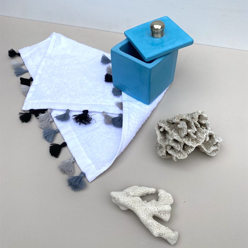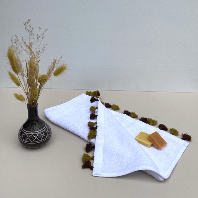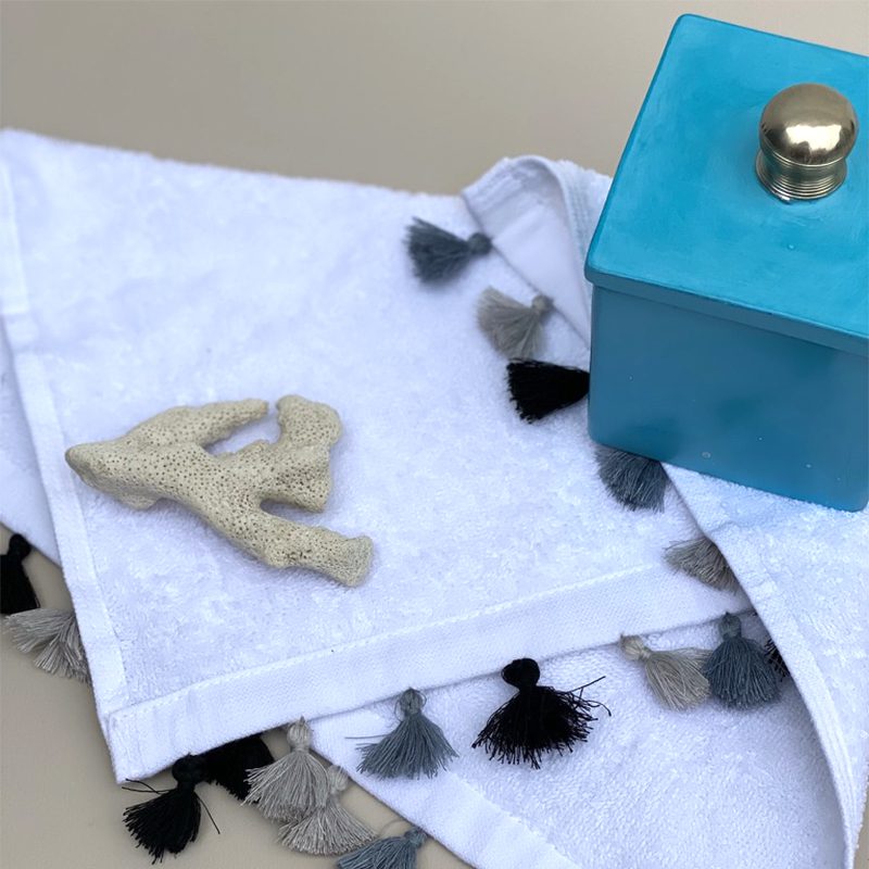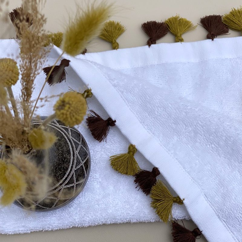 Gæstehåndklæderne er lavet i samarbejde med en lokal designer i Marrakech, hvor vi har forenet den fine ægyptiske bomuld med de marokkanske pomponer.[/vc_column_text][/vc_column][/vc_row]