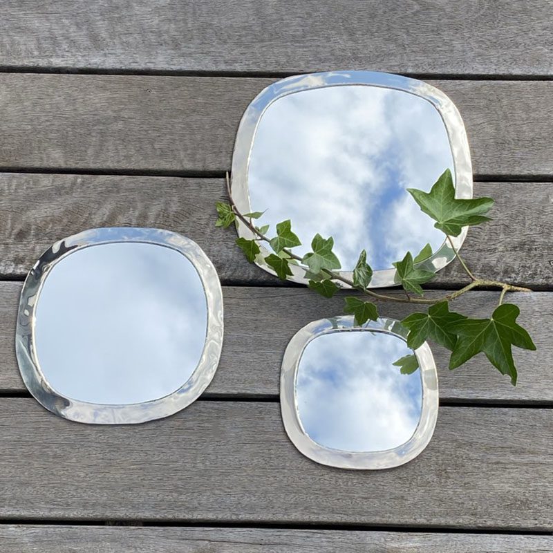 Fås i tre forskellige størrelser: L, M, S. Spejlet har skjulte beslag på bagsiden – lige til at hænge på væggen.
